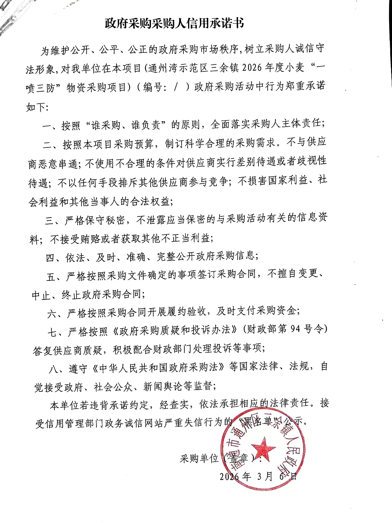 通州湾示范区三余镇2026年度小麦“一喷三防”物资采购项目询价采购公告